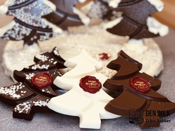 Feestelijk verpakt pakket gevuld met een kleine kerststol een chocolade kerstboom, kerst-koekkransjes en kerstchocolade.